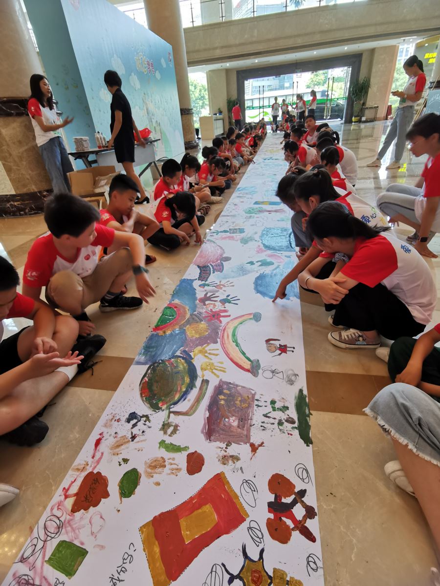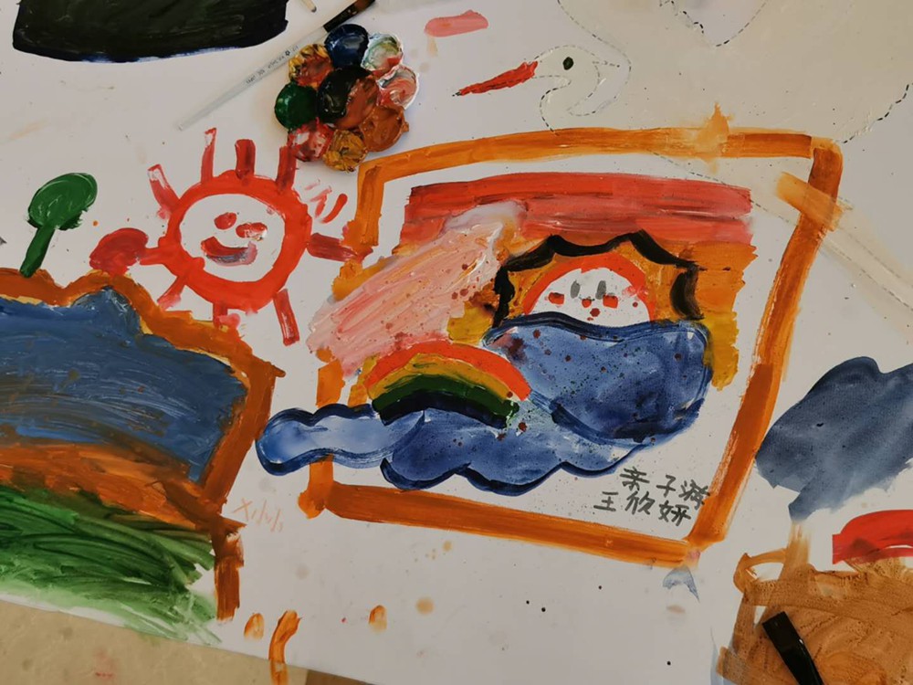 只见他们有的充分发挥着自己的创造力,,,化身“小毕加索”,,,在画布上无拘无束地释放自己的艺术灵感;有的仔细观察窗外的晴空和艳阳,,一笔一画细心创作;过程中,孩子们互帮互助,,,,帮着调颜料、、、、涂色彩,,合力完成这“梦的长卷”。。。